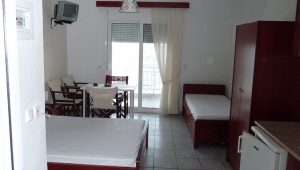 Kuća se nalazi na samoj plaži mesta Psakoudia i odlikuje se na prvom mestu terasama koje imaju direktan pogled na more. Četvorokrevetni studiji i apartmani nalaze se u prizemlju i na prvom spratu. Svi imaju TV, klima uređaj čije je korišćenje uključeno u cenu u julu i avgustu. U kući postoji i signal za besplatno korišćenje bežičnog interneta. Ispred kuće postoje suncobrani i ležaljke koji se mogu koristiti uz naplatu konzumacije pića. Iza kuće ima prostora za parkiranje vozila.