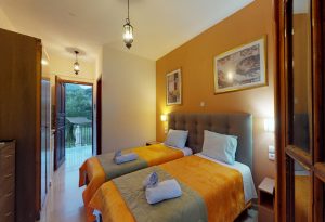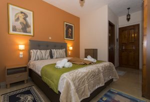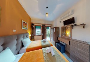DVOKREVETNI STUDIJI: Dvokrevetni studiji u svom sastavu poseduju ili francuski ležaj dimenzija 190x155cm ili dva singl standardna ležaja dimenzija 190x90cm, dva noćna stočića, stočić sa ogledalom, TV, klima uređaj (5 eura/dnevno, plaća se na licu mesta – opciono), orman, WI-FI internet konekcija (BESPLATNO korišćenje). Kuhinja se sastoji od rešoa sa jednom ringlom, frižidera, aspiratora, posuđa za dve osobe. Kupatila u svom sastavu poseduju tuš, jedan mali i jedan veliki peškir po osobi.